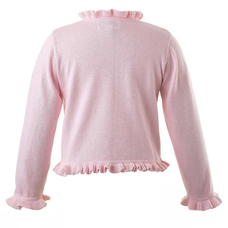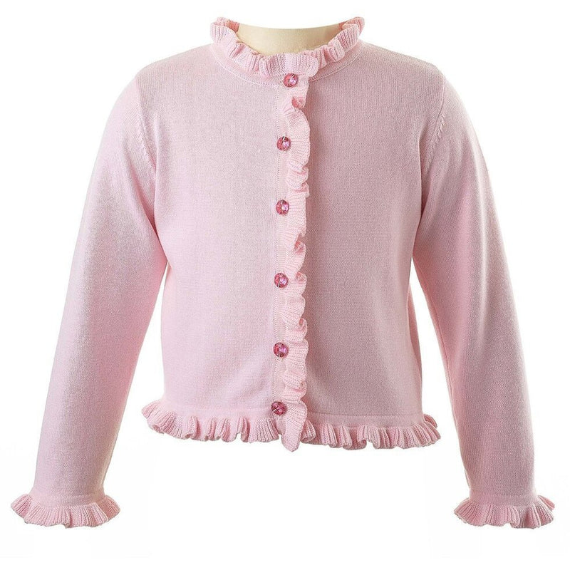 An essential layering piece! A soft cotton cardigan with stretch, in pink. Trimmed with frills at the front, neck, hem and cuffs and finished with twinkly faceted jewel effect buttons.
