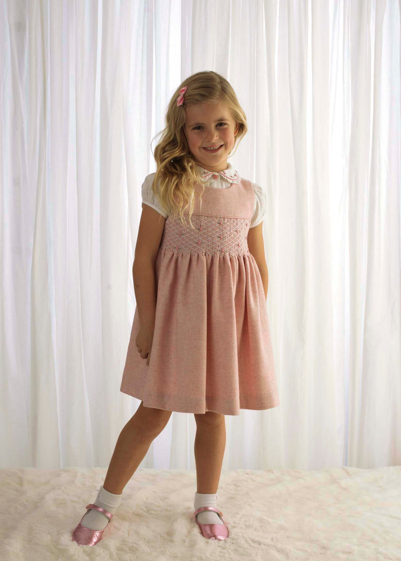 Sweet hand-smocked pinafore, with rosebud designed across the chest in a pink tweed effect wool mix fabric. Team with our rose embroidered blouse and tweed hair bow for the perfect outfit!