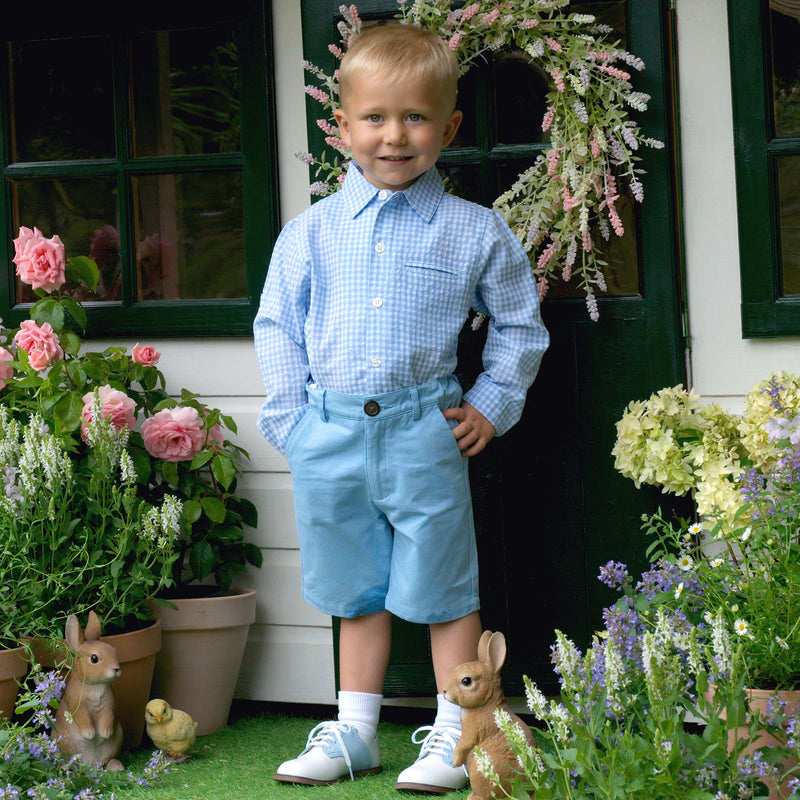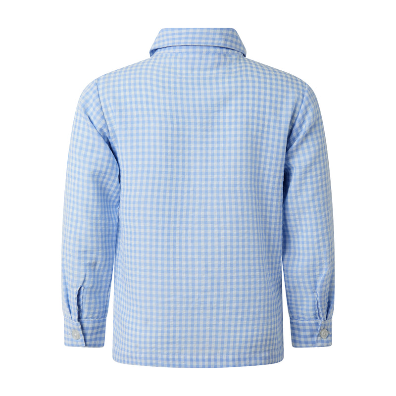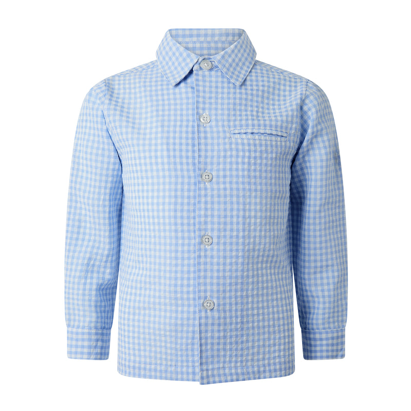 Dress your little guy in style with our Gingham Turn-up Shirt! Classic blue gingham pattern adds a touch of timeless charm. Long turn-up sleeves and a welt pocket make it practical and playful. Perfect for both formal and casual occasions, this shirt will keep your little one looking sharp and feeling comfortable.
