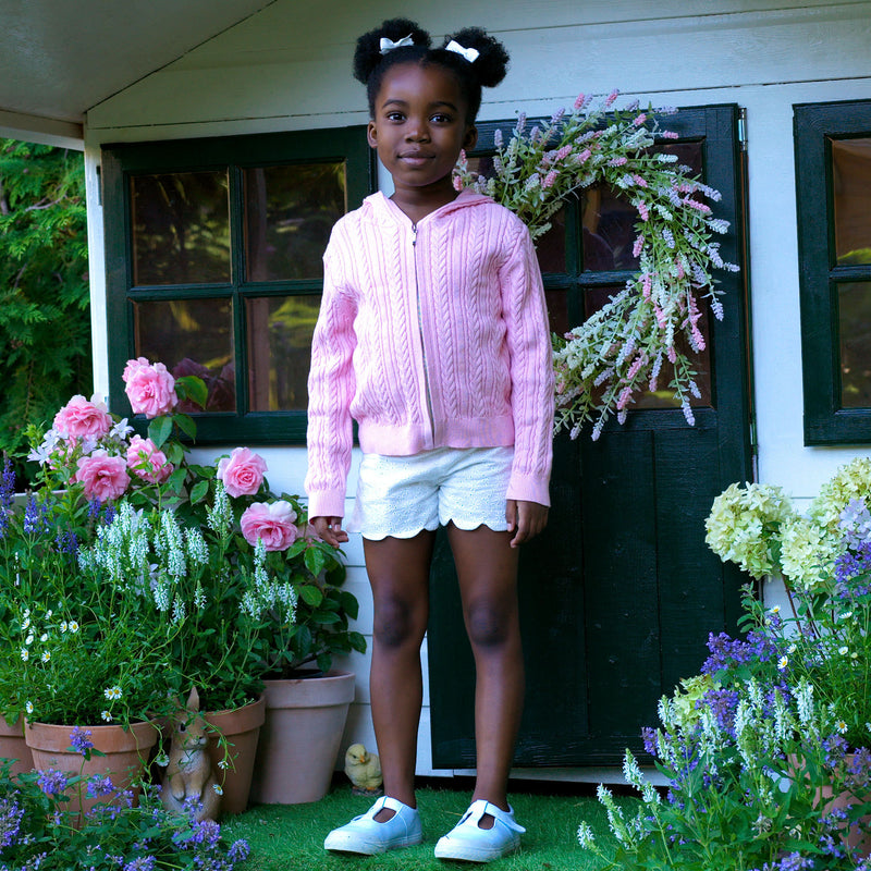 This baby pink Cable Knit Hoodie for girls is both pretty and practical. The cable knit stitching adds a touch of style, while the ribbed cuffs and hem keep your little one warm. The coordinating hoodie in a bias cut and zip closure make it easy to layer over leggings or joggers for cooler days.