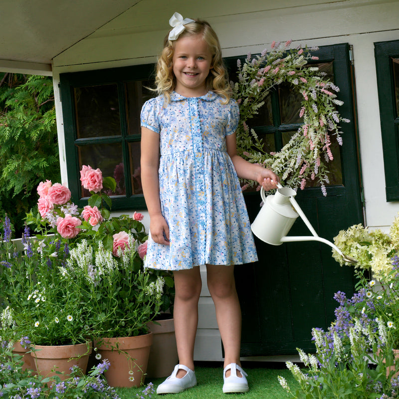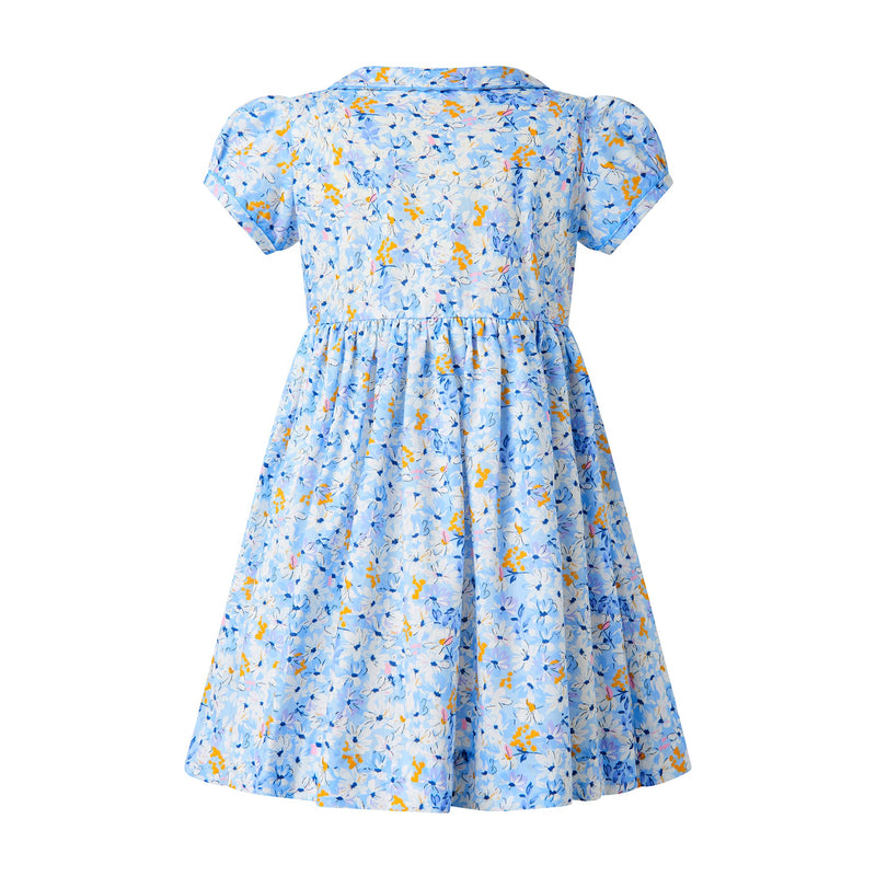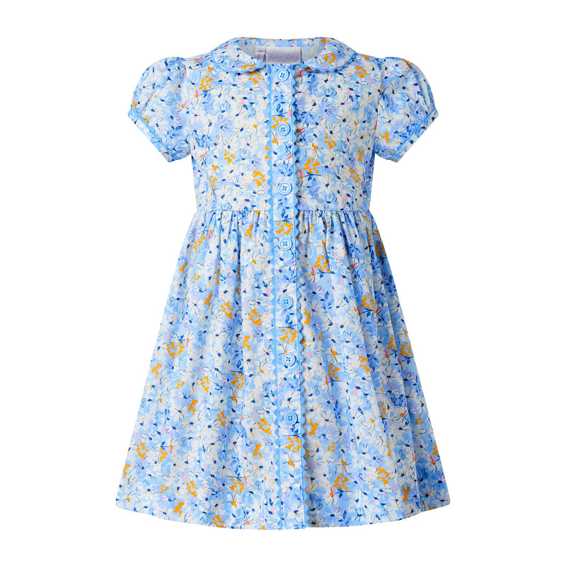 A Rachel Riley favorite, the Daisy Button-front Dress is the perfect blend of style and function. Featuring a stunning floral print is shades of ivory and yellow on blue background, this dress is completed with matching blue trimming and buttons for a timeless look. Dress also comes in Baby.