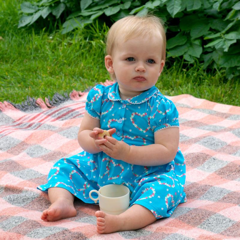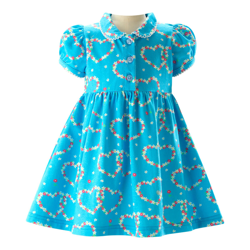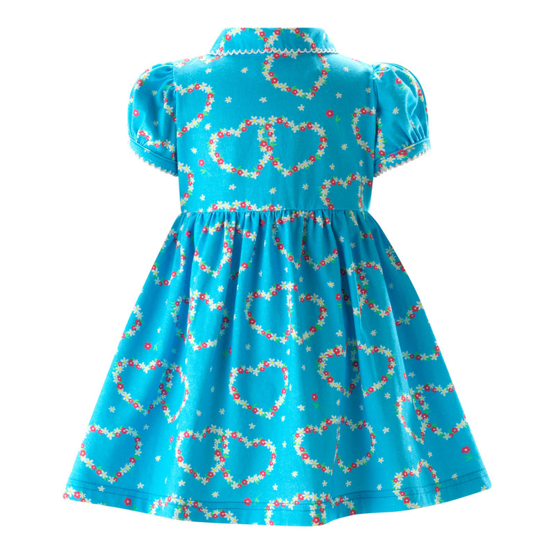 Brighten up your baby girl's spring and summer wardrobe with our Daisy Jersey Dress! This adorable dress in bright blue features a sweet print of daisy hearts, perfect for any fun occasion. With a charming peter pan collar and short puff sleeves, your little one will be comfortable and stylish all day long. A must-have for every little girl's wardrobe!
