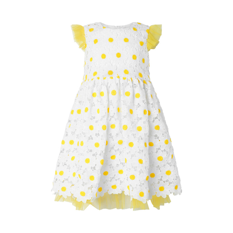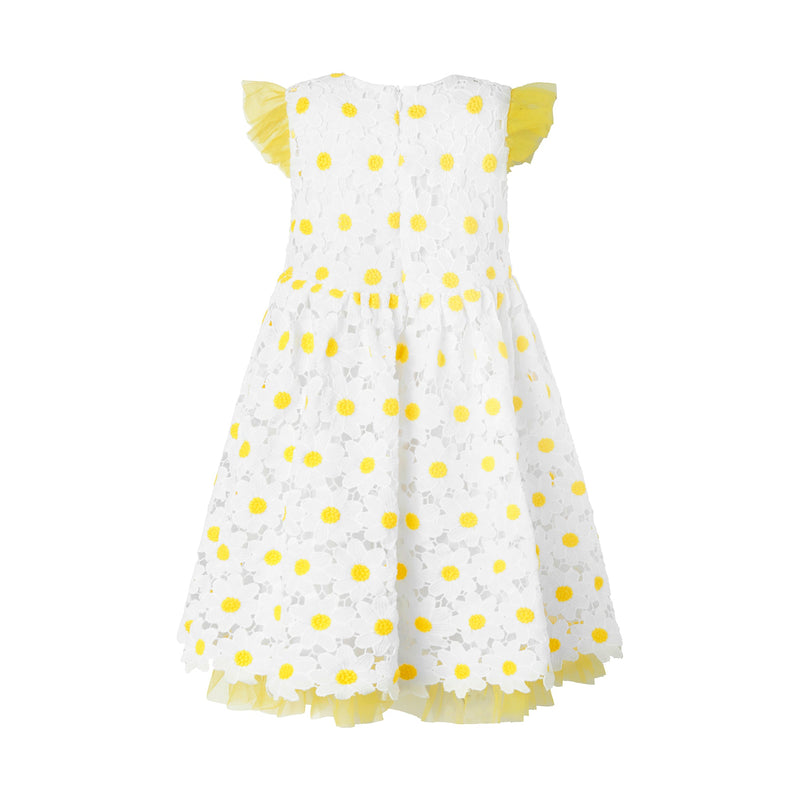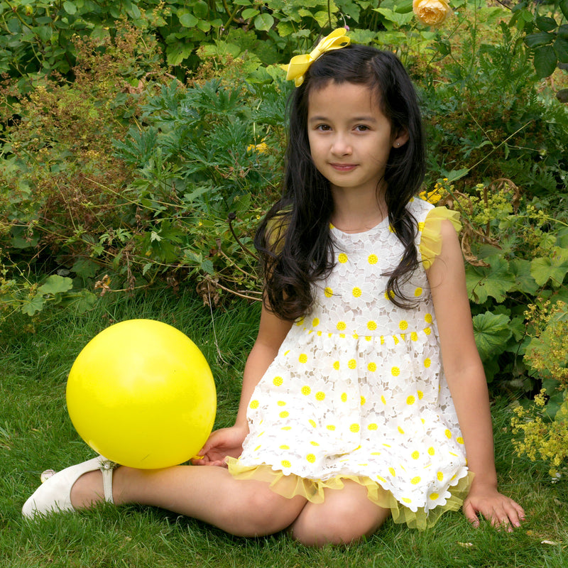 Welcome spring with our Daisy Lace Party Dress! This ivory sleeveless dress features a top layer of delicate daisy lace with yellow accents. The yellow ruffled shoulders and tulle skirt under-layer add a whimsical touch. Perfect for parties, special occasions, or as a flower girl or wedding guest outfit. Elegant and stylish.