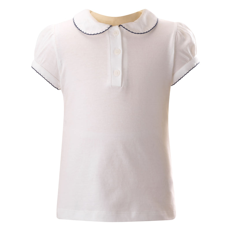 New! Introducing our practical and versatile Navy Picot Trim Polo for girls! This ivory t-shirt features a charming navy picot trimmed peter pan collar and girly short puffed sleeves. With a convenient button placket at the front, it's easy to layer with our cardigans and pair with skirts or pants for any occasion. Get excited for the possibilities!