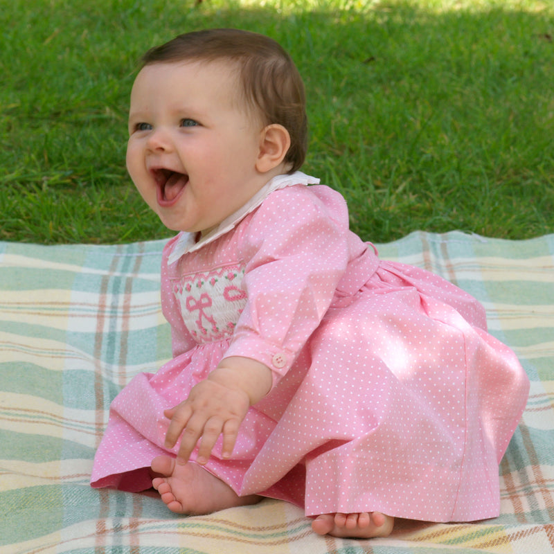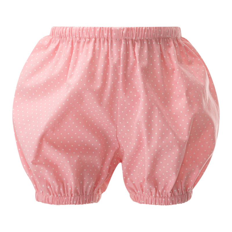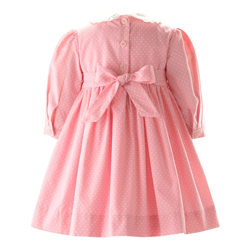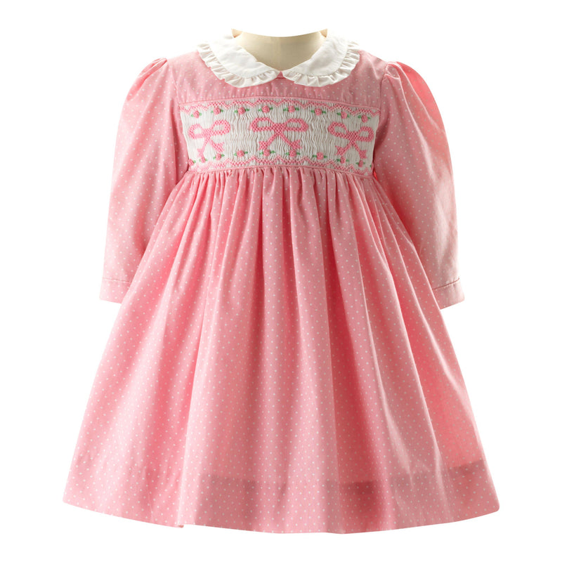 Dress up your little one in our Pindot Bow Smocked Dress & Bloomers! This adorable long-sleeved dress features pink pin dots and beautifully embroidered bows on the smocked panel. The ivory peter pan collar is accented with frills, and a sash tie at the back adds a sweet touch. Complete the look with the matching bloomers. Perfect for any occasion!