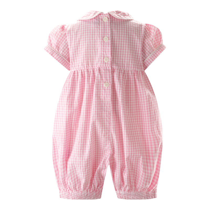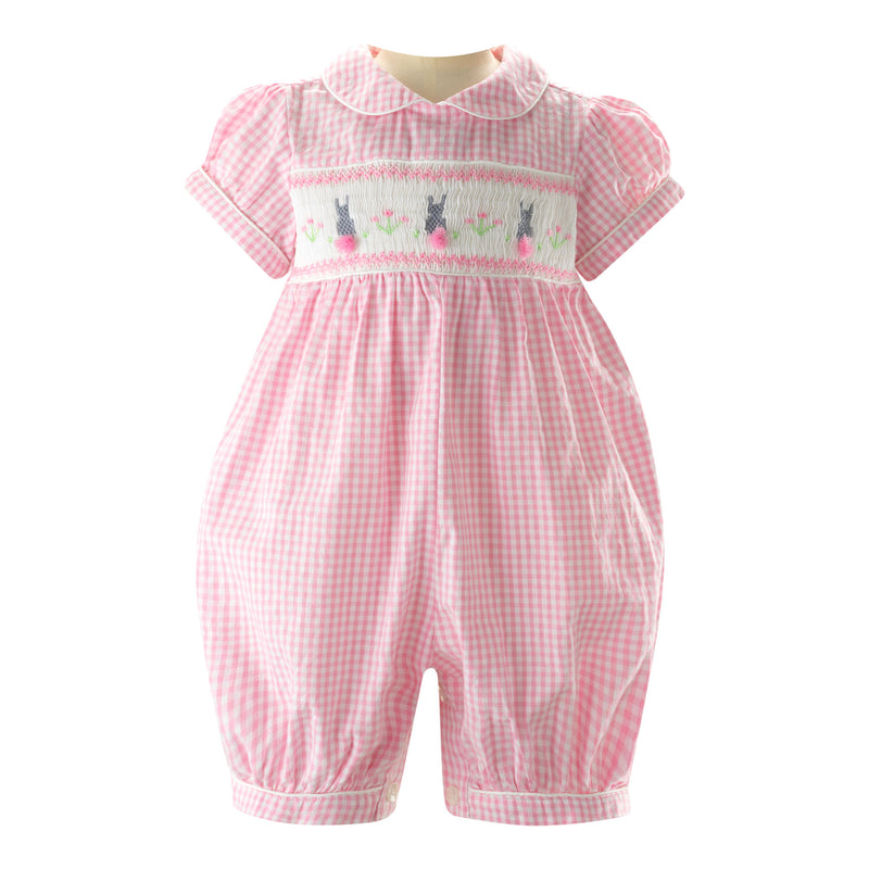 Your little one will look absolutely adorable in this Pink Gingham Bunny Smocked Babysuit! Made with soft and breathable cotton, this romper features a sweet bunny embroidered design on the smocked panel at the chest. The gathered, airy bottom allows for comfortable movement, while the button opening at the back and inner leg make dressing a breeze. Perfect for any occasion, this romper is as cute as it is comfortable.