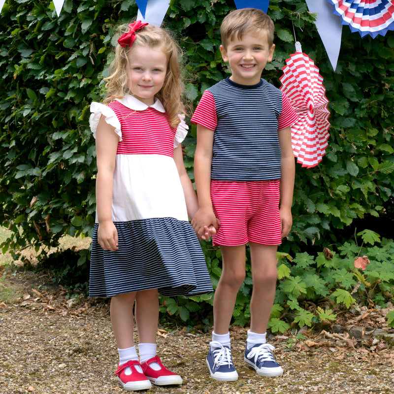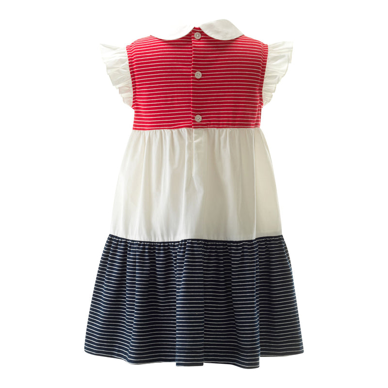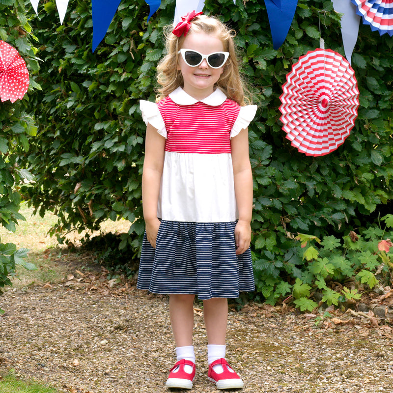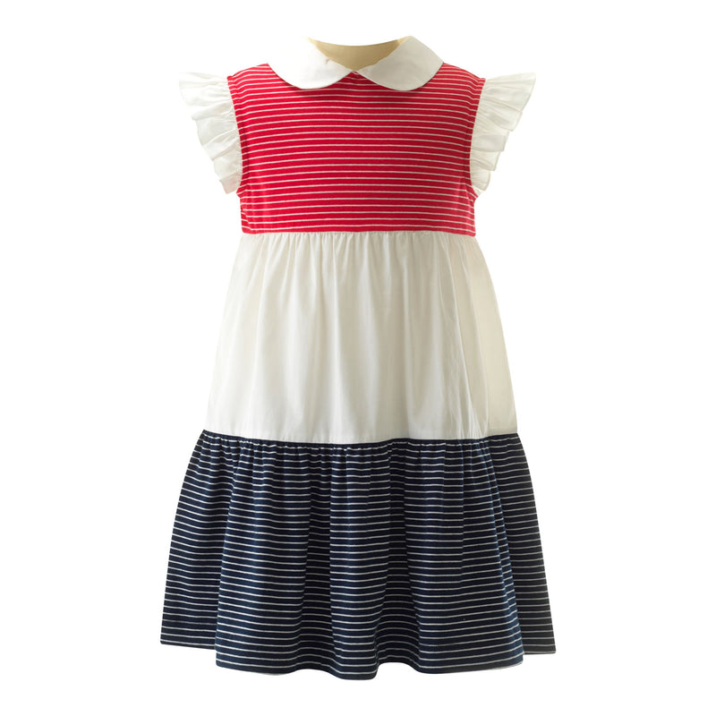 Get ready for summer with our Striped Jersey Tiered Dress! This pretty dress features alternating panels of ivory stripes on red and navy, highlighted by a charming ivory Peter Pan collar and ruffles around the shoulders. Not only is it perfect for everyday wear in warmer days, but it also adds a fun nautical touch to any outfit.
